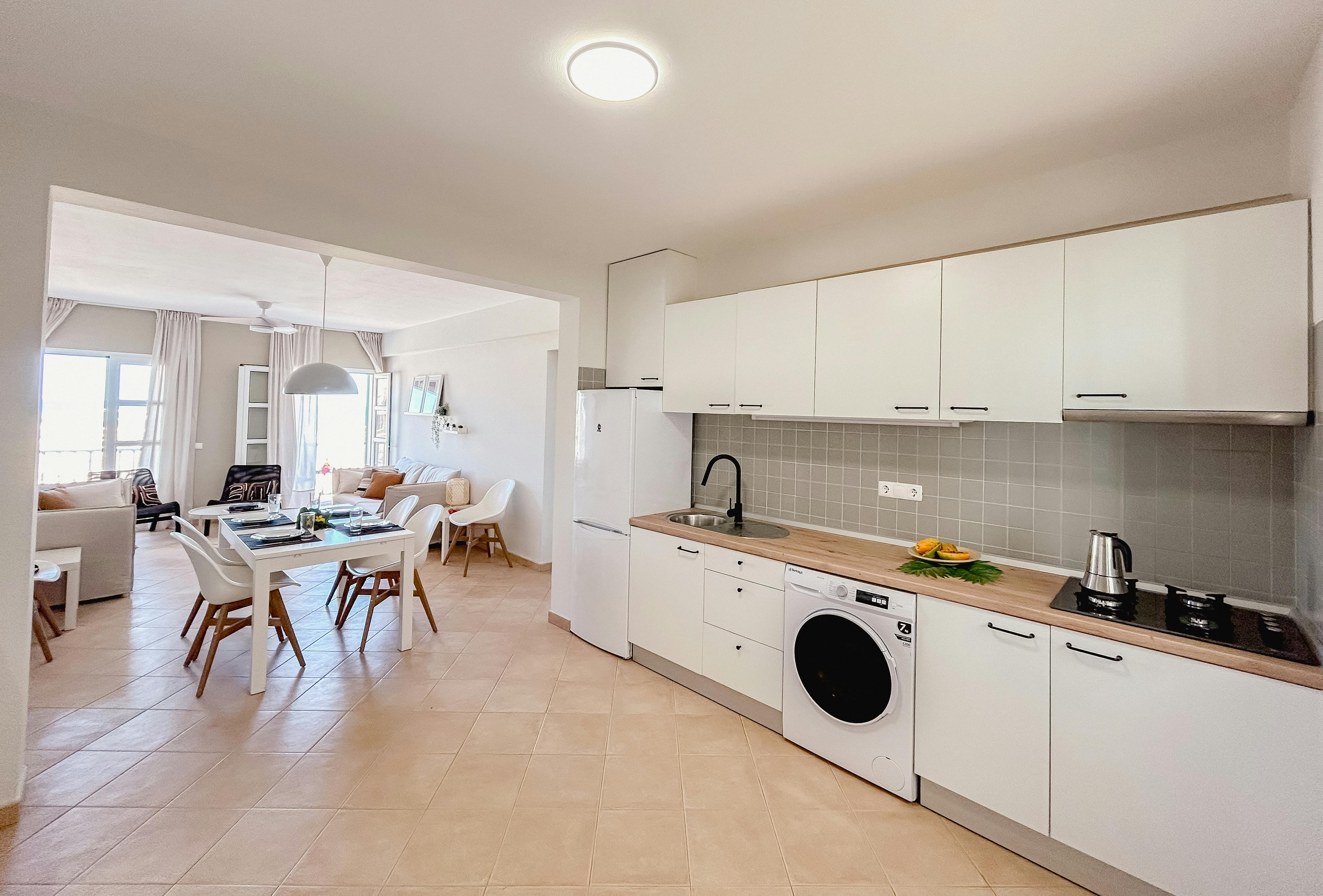 Apartment 103 m2 with four double rooms, two with king size beds and sea view and two with two single beds, 2 full bathrooms, dining room, sitting room, fully equipped kitchen and balcony with sunset sea view. No lift.
